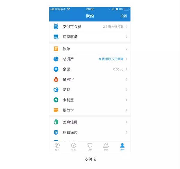 以支付宝为例,在我的页面中,首先用背景栏分隔了不同的模块移动端网站制作,然后用非贯通的分割线分隔了有关联的内容。