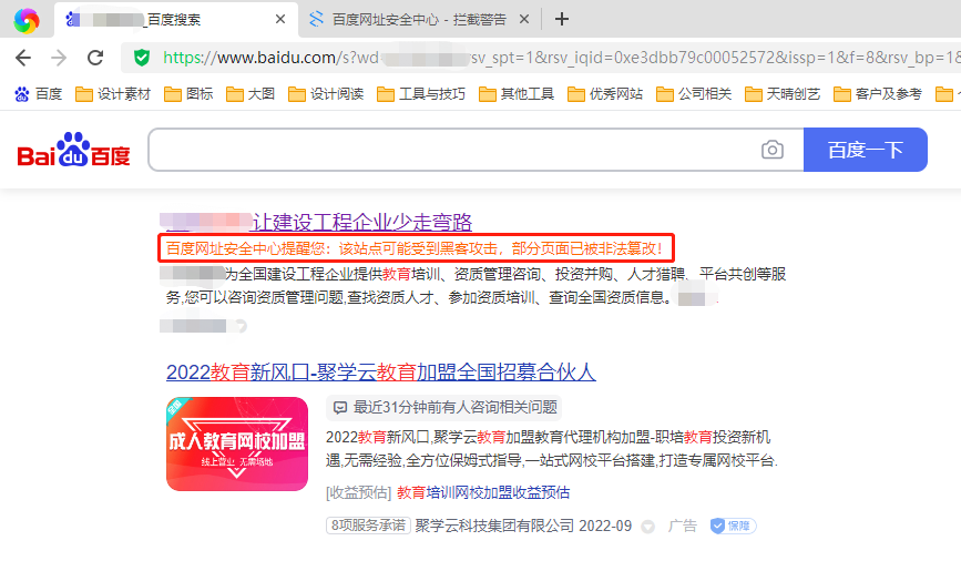 百度网址安全中心提醒您:该站点可能受到黑客攻击,部分页面已被非法篡改!